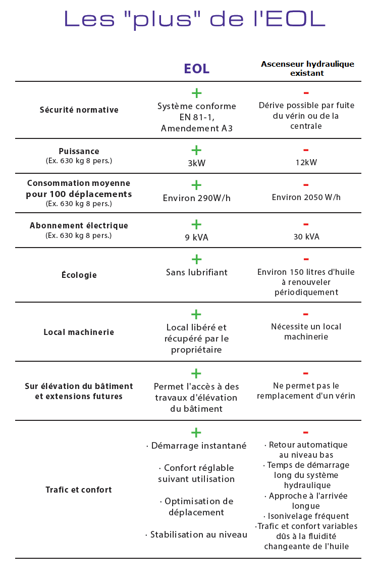 Le concept EOL permet de transformer un ascenseur hydraulique en ascenseur électrique grâce à la dernière technologie utilisée sur les ascenseurs électriques nouvelle génération. Le gain énergétique important et immédiat, un déplacement plus confortable et plus optimisé ainsi qu’un niveau de sécurité renforcé seront les premiers bénéfices ressentis.